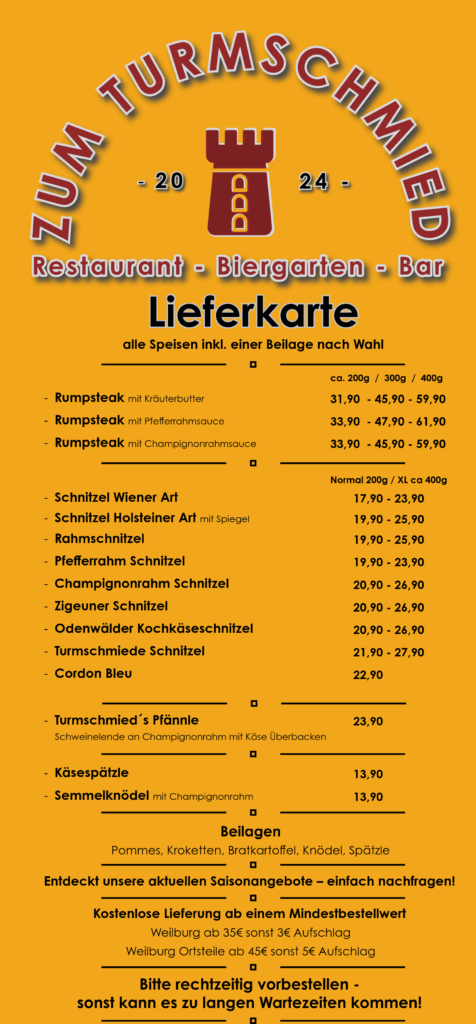 Schaut einfach in unsere aktuelle Lieferspeisekarte hier auf unserer Webseite und wählt eure Lieblingsgerichte aus. Bitte beachtet, dass wir alle Speisen frisch zubereiten – dadurch kann es je nach Bestellaufkommen und Lieferaufwand zu längeren Zubereitungs- und Lieferzeiten kommen.